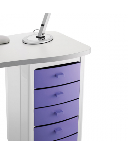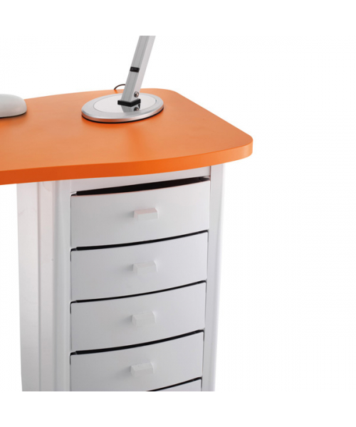 Стол маникюрный "224 LX" - с одной тумбой, столешница из дерева, тумба из пластика. Кромка столешницы серого цвета. Опорная нога серая глянцевая. Тумба маникюрного стола с артикулом A-м60003124 оснащена пятью выдвижными ящиками и колесами со стопорами для удобства перемещения.