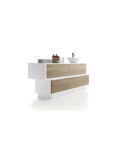 Это универсальный предмет мебели, который отлично впишется в любой интерьер. Модель выполнена из глянцевых меламиновых плит белого цвета. Выдвижные ящики изготовлены из натуральной древесины. Производитель предлагает несколько вариантов исполнения – натуральный венге, белая лиственница, дуб бардолино. Дополнительно мебель может комплектоваться раковиной со смесителем из хромированной стали. Ящики могут располагаться друг над другом или же быть смещенными относительно центра. Этот вариант мебели можно установить в любом СПА-салоне или салоне красоты.