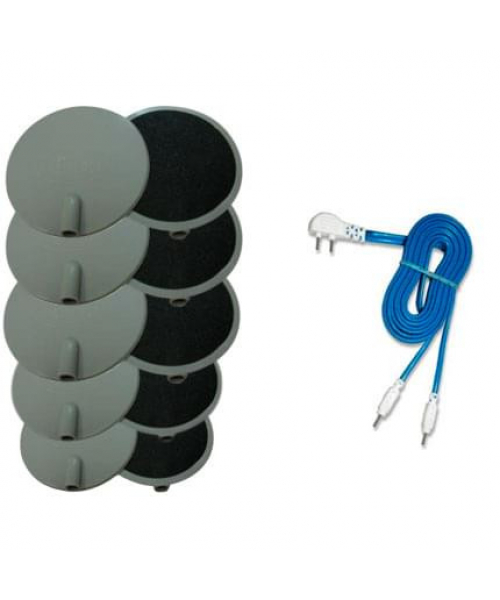 В комплект входит: 16 электродов для электромиостимуляции (2 шт d=35мм, 2 шт d=55мм, 12 шт d=75мм), 3 манипулы для ультрафонофореза и хромотерапии, фиксирующие ремни.