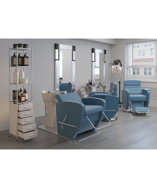 Стеллаж "Lino-5" - Компактный, вместительны и прочный, станет незаменимым помощником в работе. Металлический каркас выдержит большое количество предметов и оборудования различного веса. Открытые полки сделаны из цельных металлических листов и обрамлены бортами по периметру, что делает еще удобнее и безопаснее размещение на них инструментов, косметологических средств и даже аппаратов. Полки покрыты специальной краской, которая защищает от коррозии и влаги. Для ухода за поверхностью можно использовать моющие и дезинфицирующие средства.