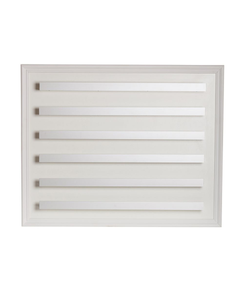 Навесная полка выполнена на едином основании из ламинированного ДСП с отделкой по периметру декоративным молдингом. На основании установлены шесть полочек с ограничителем (бортиком) из матового алюминия.