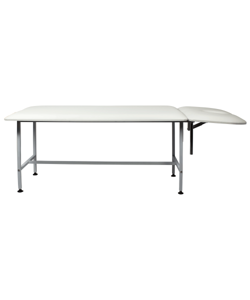 Неоспоримым преимуществом данной модели кушетки является надежный металлический каркас, который обеспечивает необходимую устойчивость даже при больших нагрузках. Для защиты от коррозии он окрашен порошковой краской белого цвета. Ножки каркаса установлены на специальные подпятники. Учитывая специфику массажных процедур, в подголовнике кушетки предусмотрено отверстие для лица. Для дополнительного удобства клиентов мастер сможет отрегулировать наклон подголовника с помощью механического рычага.