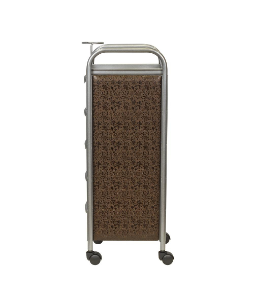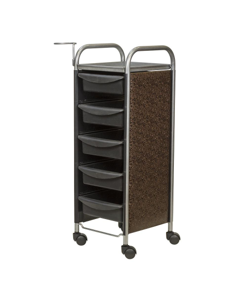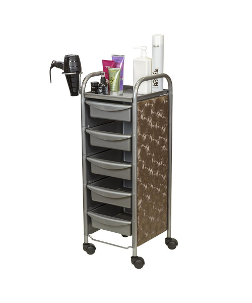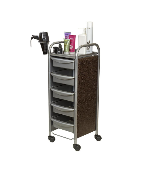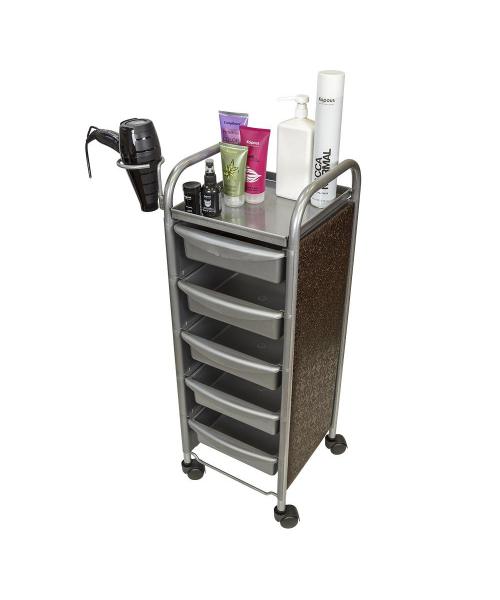 Для инструментов и расходных материалов в тележке предусмотрены пять съемных ящиков. На верхней полке можно разложить инструменты, используемые во время процедур. Для быстрого и удобного перемещения по кабинету конструкция установлена на маневренные колесики. Практичное дополнение парикмахерского оборудования – фенодержатель.