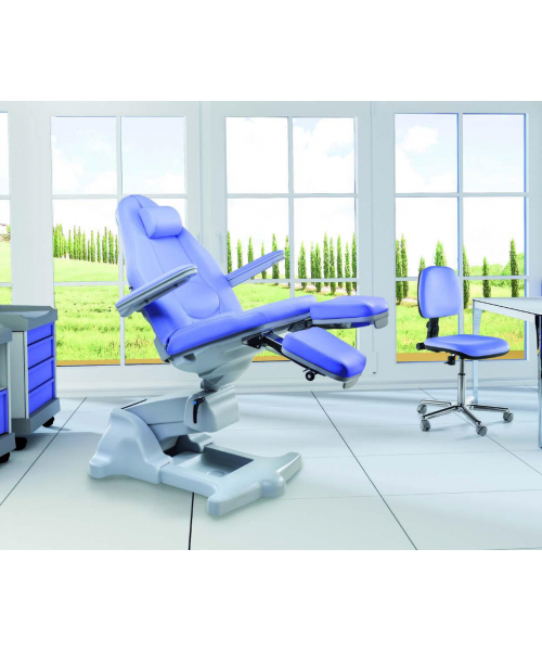 Педикюрное кресло на электроприводе с тремя моторами, имеет ножной пульт управления для регулировки высоты, угла наклона кресла и спинки. Клиент может удобно сесть в кресло благодаря его минимальной высоте, составляющей 49 см, а мастер работает в условиях максимального комфорта, имея возможность выполнять процедуры сидя или стоя: максимальная высота кресла составляет 101 см. Под заказ.