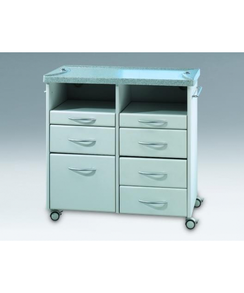 Столешница изготовлена из цельного материала, оформленного под гранит, надежного и стойкого к дезинфекции, легка в уходе и устойчива к воздействию жидкостей.