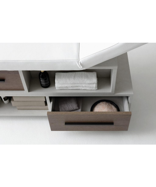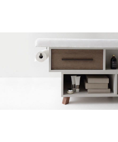 ИталияМассажная кушетка "The Wall" - оборудована двумя выдвижными ящиками, выдвижной полкой для косметического оборудования, экспозиционными отсеками для продуктов, большим отсеком для оборудования. Фронтальные ящики оснащены алюминиевыми ручками, отделка свинцово-черная. Регулируемая спинка. Оснащена держателем рулона и деревянными ножками.