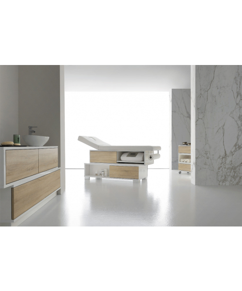 Выполнена из белого глянцевого меламина. Данный материал отличается высокой прочностью, сопоставимой с прочностными характеристиками деревянного шпона. Модель имеет два выдвижных ящика и расположенную между ними открытую полку. Все отсеки вместительные и подходят для хранения не только СПА-средств, но и полотенец. Благодаря наличию колес тележку можно легко перемещать. Ящики доступны в трех вариантах отделки: натуральный венге, белая лиственница, дуб бардолино. Цвет каркаса остается неизменным – белым. Благодаря использованию базовых цветов такая модель прекрасно впишется в любой интерьер.